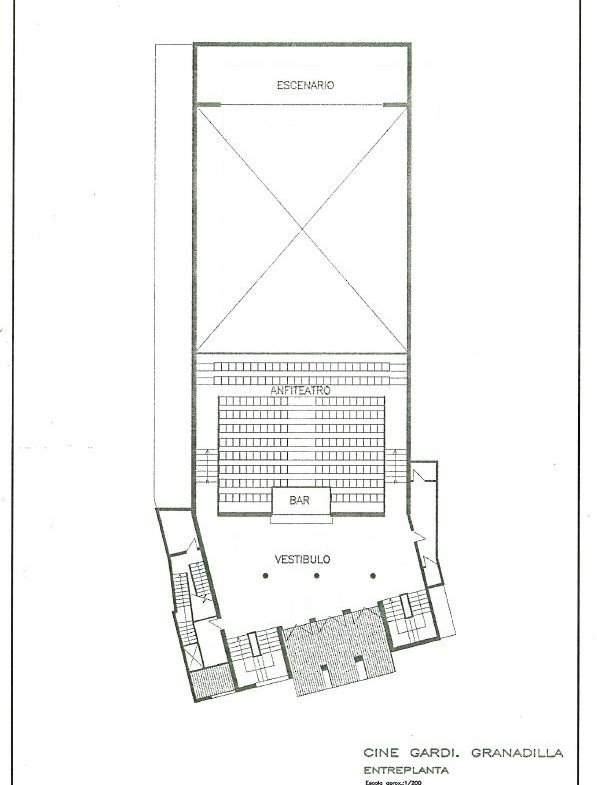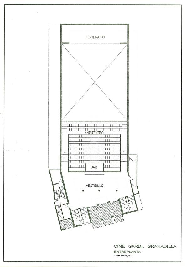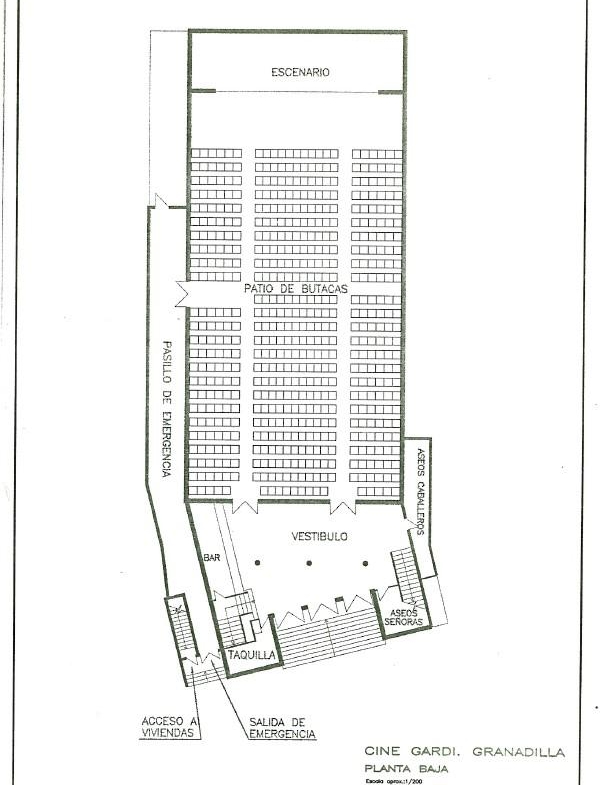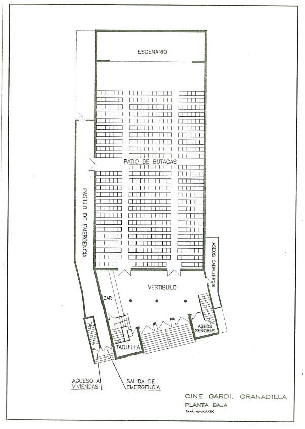 Desde el vestíbulo y a través de dos amplias puertas se pasa al patio de butacas, divido por dos pasillos longitudinales y uno transversal. Por este último se sale a un pasillo de emergencia que desemboca directamente en la calle y comunica también con la finca trasera del cine. En el fondo de la sala está el escenario, con pantalla de proyección plegable y cortinaje dotado de aparellaje eléctrico. El suelo del escenario es un tablado de madera y bajo el mismo y en toda su superficie se dispone de camerinos y servicios, con acceso desde la sala y directo al escenario también.