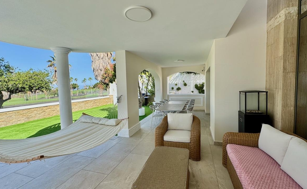 En el exterior, la vivienda cuenta con un elegante jardín privado y una fantástica piscina, perfectos para disfrutar del clima, la tranquilidad y las vistas incomparables al campo de golf. La conexión directa con el entorno convierte esta propiedad en una residencia verdaderamente singular.